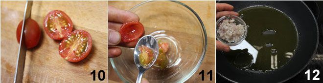 Mientras tanto, cortad en cuartos los tomatitos 10 y quitad las semillas 11. Picad el cebollino y ponedlo a pochar con un par de cucharadas de aceite de oliva 12,