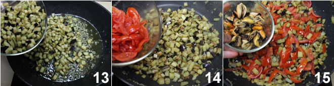 luego añadid las berenjenas 13, los tomatitos 14, sal para sazonar las verduras y dejad cocinar durante 10 minutos. Cuando estén cocidas, añadid los mejillones 15,