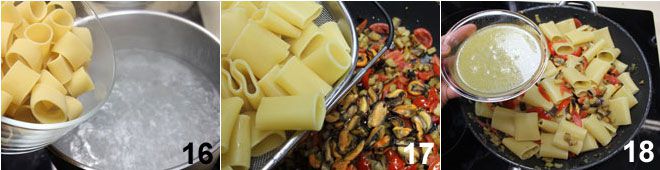 luego hervid una olla de agua con sal y poned a cocer los paccheri 16. Escurridlos al dente y añadidlos a la salsa 17, luego agregad el agua de cocción de los mejillones que habéis reservado anteriormente 18.