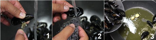 Para preparar los paccheri con berenjenas, mejillones y mozzarella de búfala, comenzad limpiando bien los mejillones. Eliminad la barba que sale 1, raspad la concha y lavadlos bien bajo agua corriente para eliminar todas las impurezas 2 (para más detalles sobre la limpieza de los mejillones Cómo limpiar y abrir los mejillones). Una vez limpios los mejillones, ponedlos en una sartén con dos cucharadas de aceite y dos dientes de ajo y dejad que se abran 3.