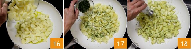 En una sartén amplia, vierte el aceite hasta cubrir el fondo y caliéntalo por unos instantes. Luego, añade las patatas cortadas 16 y cocina a fuego medio durante unos 20-25 minutos, mezclando a menudo hasta que estén bien doradas por todos lados. Luego, añade la mezcla de hierbas aromáticas picadas previamente 17, mezcla y deja que tomen sabor durante 1-2 minutos. Apaga el fuego y ajusta de sal a gusto 18.