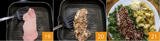 Luego pasa a la preparación de la paillard. Calienta una parrilla de hierro fundido a fuego alto. Toma la paillard, golpéala ligeramente con el mazo si es necesario para que la loncha quede solo de unos pocos milímetros de grosor y colócala en la plancha para que se dore unos segundos 19. Luego gírala usando una espátula porque con las púas de un tenedor arriesgarías a hacer salir los jugos internos de la carne y el resultado sería más seco. Cocina durante unos segundos también por el otro lado 20. Ahora que tienes todos los ingredientes listos, puedes componer tu segundo plato: por ejemplo, puedes disponer en un plato de servir una cama de ensalada de canónigos y colocar la paillard con las patatas al lado y la mayonesa que habrás sacado del frigorífico 21. ¡Sirve tu paillard con patatas y mayonesa al comino caliente!