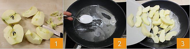 Para preparar el pain perdu con manzanas caramelizadas, comenzad a preparar estas últimas: pelad las manzanas lavadas, eliminad el corazón y cortadlas en rodajas no demasiado finas 1. Colocad en una sartén la mantequilla, dejad que se derrita y añadid el azúcar 2, luego colocad las rodajas de manzana 3.