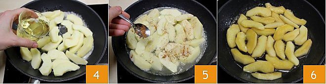 Rociad las manzanas con el vino 4, añadid la canela 5 y cocinadlas (sin moverlas con una cuchara de madera para no romperlas) a fuego muy bajo, hasta que las manzanas estén cocidas y caramelizadas 6.