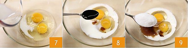 Pasad ahora a la preparación del pain perdu: en un bol, romped los huevos y añadid la leche 7, el extracto de vainilla 8 y el azúcar 9.