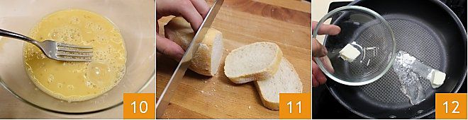 Batid todo con un tenedor para mezclar bien los ingredientes 10. Cortad rebanadas (no demasiado grandes, si lo son, divididlas a la mitad) de pan duro 11 y poned a derretir la cantidad suficiente de mantequilla para cubrir el fondo de una sartén antiadherente 12.