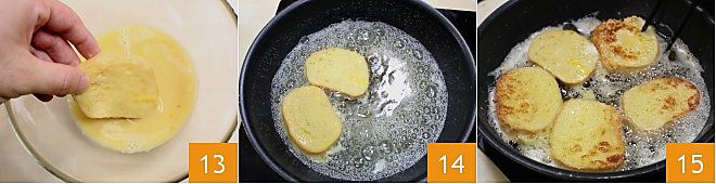 Sumergid las rebanadas de pan por ambos lados en la mezcla 13 y pasadlas directamente a la sartén para freírlas 14. Doradlas bien por ambos lados, dándoles la vuelta con unas pinzas 15 y, una vez listas, ponedlas sobre papel de cocina absorbente.