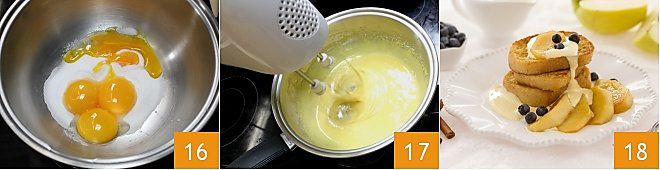 Mientras tanto, preparad el sabayón (clic aquí para más indicaciones) batiendo con las varillas de una batidora las yemas con el azúcar en un cazo colocado al baño maría (16-17): añadid la canela y el vino, una cucharada a la vez, siempre batiendo hasta su completa absorción. Cuando el sabayón esté listo, podéis emplatar todo: poned tres rebanadas de pan una sobre otra en un plato de servir, colocad cerca del pan algunas rodajas de manzana caramelizada y terminad con la adición de un par de cucharadas de sabayón 18: ¡vuestro pain perdu con manzanas caramelizadas está listo!