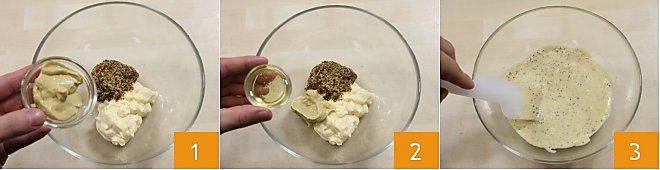 Para preparar los palitos de pollo con salsa de mostaza, comienza por la salsa: añade a la mayonesa primero la mostaza de Dijon, luego la más delicada 1 y, por último, la miel 2. Mezcla con una espátula o una cuchara para obtener una mezcla homogénea 3 y cubre el bol con film transparente. Luego guarda el bol en la nevera.