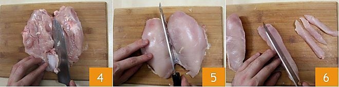 Limpia la pechuga de pollo con un cuchillo de cualquier grasa o cartílagos internos 4, dale la vuelta con la parte interna apoyada sobre la tabla de cortar 5, y después córtala en rodajas de un centímetro y medio de grosor, que reducirás a tiras con sección cuadrada 6.
