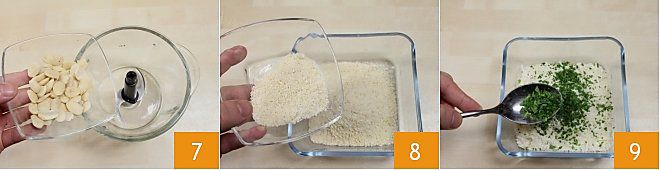 Pica las almendras groseramente, ayudándote con un picador 7. En un bol, añade a las almendras picadas, el pan rallado, el queso rallado 8, la pimienta y el perejil picado 9.