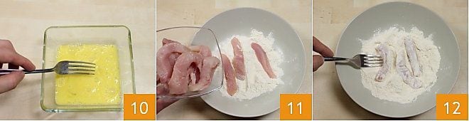 En un bol aparte, pon los huevos cascados y bátelos con un tenedor ajustando de sal 10. En otro bol, pon la harina. Pasa los palitos de pollo por la harina 11 hasta cubrirlos completamente 12.