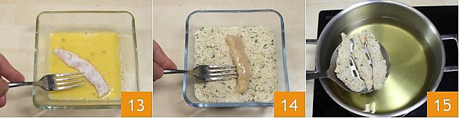 Una vez enharinados, pásalos por el huevo batido 13 y luego por el empanado 14. En una cazuela, calienta el aceite durante algunos minutos. Para saber cuándo está bien caliente, prueba a dejar caer un poco de pan rallado; si chisporrotea, entonces sumerge los palitos 15.