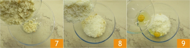 Verted las migas de pan en un bol 7, añadid el Pecorino rallado 8 y los huevos 9.