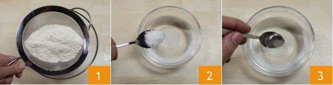 Para preparar el pan armenio, comienza reuniendo en un bol la harina manitoba tamizada con un colador de malla fina 1 (en lugar de la harina manitoba, puedes elegir una harina fuerte que presente al menos un 11% de proteínas en su composición, que puedes leer en el envase). En un pequeño cuenco, vierte el agua a temperatura ambiente y añade la sal 2. Luego, mezcla para disolverla completamente 3.