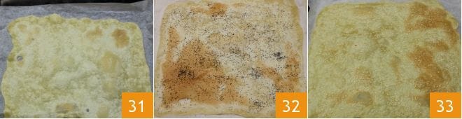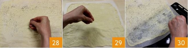 O, antes de hornearlo, puedes espolvorearlo con semillas de amapola 28 o de sésamo 29. Una vez listo, desliza el papel de horno sobre la bandeja bien caliente 30 y hornea en horno estático precalentado a 220° durante 4-6 minutos según el grosor de la masa. Puedes cocer las tres partes de masa una a la vez.