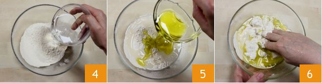 Añade el agua y la sal a la harina 4 y luego el aceite 5. Comienza a amasar rápidamente los ingredientes con la punta de los dedos 6.