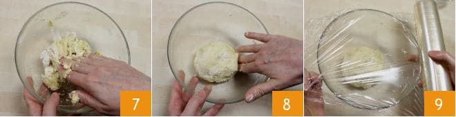 Esta masa no necesita ser trabajada durante mucho tiempo, así que manéjala durante unos pocos minutos 7 para hacerla homogénea. Con la masa obtenida, forma una bolita para conservar en el bol 8 cubierto con film transparente 9. Deja reposar la masa durante 30 minutos a temperatura ambiente.