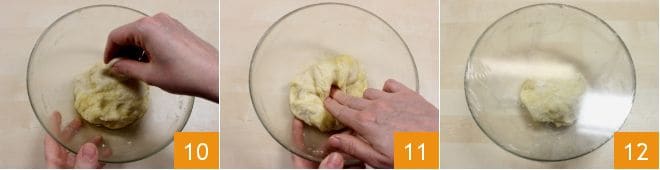 Pasada la primera media hora, retoma tu masa y comienza a hacer los pliegues: levanta suavemente los bordes externos de la masa 10 y llévalos hacia el centro 11. Realiza esta operación 8 veces a lo largo de toda la circunferencia de la masa. Luego, dale la vuelta a la masa y forma una bolita; cubre con el film transparente 12 y deja reposar otros 30 minutos a temperatura ambiente.