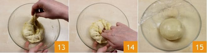 Pasada la segunda media hora, retoma la masa para efectuar nuevamente los 8 pliegues como en el paso anterior: toma los bordes externos de la masa 13 y llévalos hacia el centro 14, 8 veces a lo largo de todo el perímetro de la masa. Luego, voltea nuevamente la masa para formar una bolita y cubre con film transparente 15. Deja reposar también esta masa durante 30 minutos a temperatura ambiente.