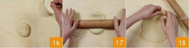Pasada la tercera media hora, toma el bol con la masa. Enciende el horno en modo estático a 220° con la bandeja para hornear dentro que utilizarás para hornear el pan armenio, para que esté bien caliente cuando coloques la masa sobre ella. Prepara también el papel de horno: corta tres hojas del mismo tamaño que la bandeja que utilizarás. Luego, divide la masa en 3 partes de 120 gr de peso cada una. Coloca la primera porción de masa sobre la superficie de trabajo 16 y conserva el resto de la masa en un bol cubierto con film transparente a temperatura ambiente, para que mantenga la humedad adecuada. Con un rodillo, extiende ligeramente la masa para uniformar el grosor 17, luego tómala suavemente entre las manos para continuar extendiéndola 18.
