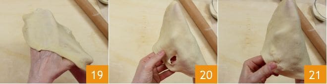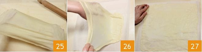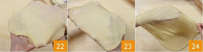 Luego, continúa trabajando la masa en extensión (22-23), tirando suavemente de los bordes con los dedos para alargarla en la forma rectangular 24.
