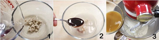 Para preparar el pan relleno de tocino y higos, comience por la realización de la masa de pan (para más detalles sobre la elaboración de la masa de pan haga clic aquí): disuelva la levadura de cerveza en un poco de agua tibia (extraída de la cantidad total de agua prevista para la receta) 1 junto con una cucharadita de malta (o de azúcar, si no dispone de este ingrediente en particular) 2. Aparte, tamice juntos la harina 00 y la harina manitoba y colóquelas en la batidora, luego agregue la mezcla de levadura y malta y active el aparato para mezclar todos los ingredientes 3.