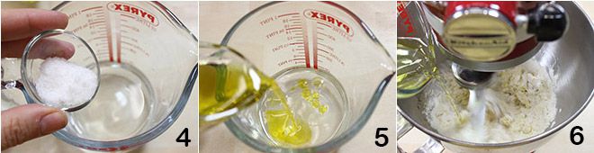 En el agua restante, disuelva la sal 4 y añada el aceite 5, mezcle bien, luego vierta el líquido obtenido en la harina, continuando a mezclar 6. Amasar todo durante 10 minutos, o hasta obtener una masa compacta.