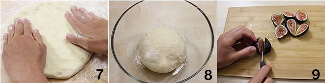 Transfiera ahora la masa a una superficie enharinada y continúe amasando con las manos durante otros 5 minutos 7. Cuando haya obtenido una masa suficientemente compacta y elástica, forme una bola y colóquela en un bol enharinado, cubierto con film transparente 8. Ponga el bol en el horno cerrado y apagado, y deje que leve durante al menos 2 horas. Pasado el tiempo necesario, lave bien los higos y córtelos en cuartos, manteniendo la piel 9,