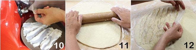 luego corte 30 lonchas de un trozo entero de tocino, utilizando la cortadora (si no la tiene, recomendamos comprar el tocino ya cortado) 10. Espolvoree nuevamente la superficie con un poco de harina y extienda, con la ayuda de un rodillo, la masa de pan en forma de óvalo con un grosor de aproximadamente 1-2 cm 11. Coloque sobre la masa las lonchas de tocino, hasta cubrir completamente la superficie 12,