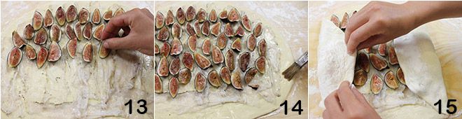 luego disponga los higos 13. Pinte los bordes de la masa con agua 14 y comience a cerrar la masa: doble el borde derecho hacia adentro, luego el izquierdo 15