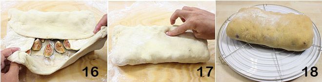 y continúe doblando también el borde superior e inferior 16. Presione con los dedos sobre el cierre para sellar todo 17, luego coloque el pan obtenido sobre una bandeja forrada con papel de horno y hornee a 200° durante 35-40 minutos. El pan relleno de tocino y higos está listo 18, sírvalo a temperatura ambiente cortado en rebanadas.