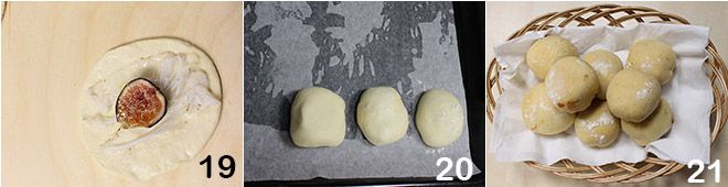 Una alternativa sabrosa podría ser preparar unos panecillos individuales. Forme con la masa de pan unos discos de aproximadamente 9 cm de diámetro, luego coloque en cada uno algunas lonchas de tocino y un higo dividido a la mitad 19. Pinte los bordes de cada disco con agua y proceda a cerrarlos siguiendo las indicaciones de la receta. Coloque los panecillos en una bandeja cubierta con papel de horno 20 y hornee a 200° durante 35-40 minutos 21.