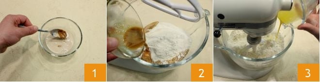 Para preparar el pan tricolor, disolved la levadura de cerveza deshidratada en un poco de agua tibia (tomada de los 250 ml que se necesitan para la masa) y añadid el malta 1 (podéis sustituir el malta por azúcar: en este caso añadidlo a la harina tamizada). Mezclad con una cucharita y unid la mezcla a la harina tamizada y vertida en el bol de una amasadora 2; trabajad los ingredientes con la varilla de hoja a velocidad media, luego añadid el huevo 3