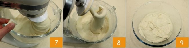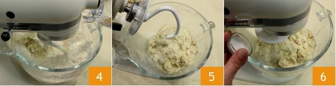y la cantidad de agua tibia indicada para la masa 4. Continuad amasando y cuando la mezcla sea homogénea, detened la amasadora y cambiad la varilla por el gancho 5, verted la sal 6