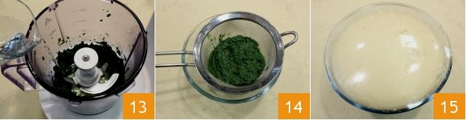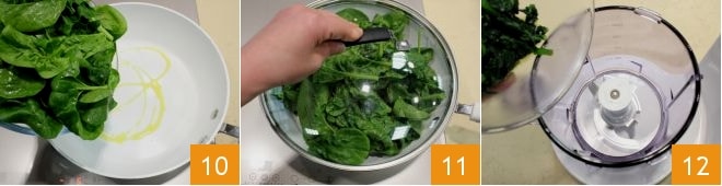 Mientras tanto, lavad las espinacas y estofadlas en sartén con un chorrito de aceite cubiertas con una tapa (10-11). Una vez cocidas, dejadlas enfriar y luego vertedlas en la licuadora 12