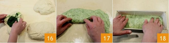 trasladadla a una superficie de trabajo ligeramente aceitada y divididla en tres partes (podéis envolver en film las que no utilicéis al momento) y condimentad una con las espinacas 16 amasando para integrarlas de manera homogénea 17. Luego untad con mantequilla y forrad con papel de horno un molde de plumcake de 30x11 cm y colocad la masa verde en el interior 18.