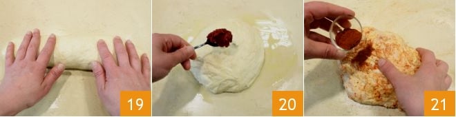 Continuad manejando la masa clara y para darle la forma de barra de las mismas dimensiones del molde 19 y colocadla encima de la masa verde en el molde. Condimentad luego la última parte de la masa con el concentrado de tomate 20 y el pimentón 21.