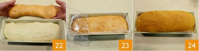 Proceded de la misma manera y colocad también la masa roja en el molde 22. Cubrid con film transparente 23 y dejad leudar durante al menos 30 minutos al resguardo de corrientes de aire. Pasado el tiempo necesario, hornead el pan tricolor en horno estático precalentado a 200° durante unos 60 minutos (180° durante 50 minutos si es horno ventilado). Verificad la cocción con un palillo antes de terminar la cocción; cuando el pan tricolor esté cocido, sacadlo del horno y dejadlo enfriar al menos 20 minutos en el molde 24 y luego dadle la vuelta sobre una rejilla para que se enfríe completamente.