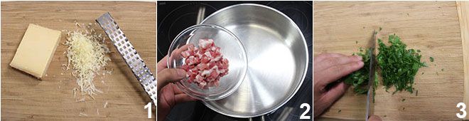 Para preparar los pancakes salados con hierbas, empezad rallando el queso gruyere de manera gruesa 1 y reservadlo. Dorad los cubos de bacon en una sartén antiadherente sin añadir grasa 2 y dejad que se doren a fuego lento, luego escurrid el exceso de grasa y reservadlos. Picad las hierbas por separado: el cebollino, la albahaca y el perejil 3.