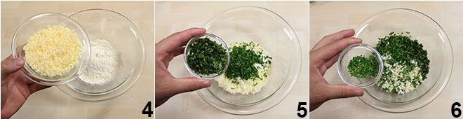 En un bol, poned la harina y la levadura química en polvo tamizadas y añadid el queso rallado 4 y, una a una, las hierbas picadas: el perejil, el cebollino y la albahaca (5-6).