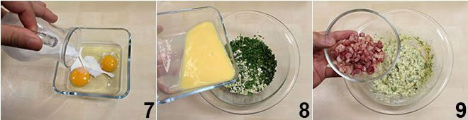 En un bol pequeño aparte, batid los huevos con la leche 7 y añadid el líquido obtenido al bol que contiene el resto de los ingredientes secos 8. Mezclad bien hasta obtener una mezcla suave y homogénea, unid los cubos de bacon dorados 9, salpimentad y mezclad por última vez.