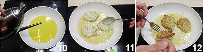 En una pequeña sartén antiadherente, poned 2 cucharadas de aceite de oliva virgen extra 10 y calentadlo al fuego: tomad 3 cucharadas de masa cada vez y colocadlas en la sartén 11, formando 3 pancakes que cocinaréis por ambos lados hasta que se doren 12. Sacad los pancakes de la sartén, escurridlos sobre papel absorbente y mantenedlos calientes; poned otra cucharada de aceite de oliva en la sartén y freíd los pancakes restantes de la misma manera.
