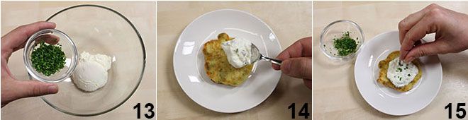 Preparad la crema que acompañará los pancakes salados mezclando de manera homogénea, dentro de un bol pequeño, la nata agria (o el yogur griego) y medio cucharada de cebollino picado 13, la sal y la pimienta. Servid los pancakes salados con hierbas con una cucharada de crema sobre cada uno 14 y una pizca de cebollino restante 15.