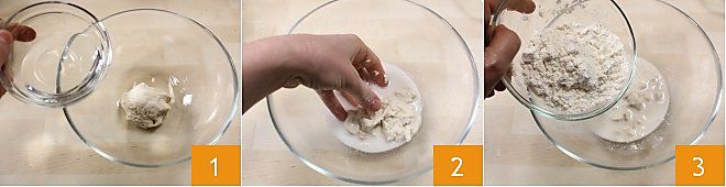 Para preparar el pan cafone tendrás que realizar 3 masas diferentes. Comencemos con la primera: toma 70 gr de tu levadura madre (aquí la receta de GialloZafferano), o consigue la levadura madre en tu panadería de confianza, y colócala en un bol junto con el agua 1. Disuelve la levadura con las manos 2, luego añade la harina 0 en forma de lluvia 3 y