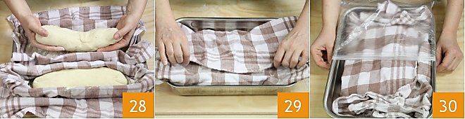 Coloca las barras cada una sobre un paño 28, espolvoréalas con abundante sémola y cierra los extremos de los paños, para cubrir los panes 29. Cubre la bandeja con film transparente (no demasiado apretado, de lo contrario no habrá espacio para la levadura) o ponla dentro de una bolsa para alimentos 30. El pan cafone deberá leudar durante 8-10 horas.