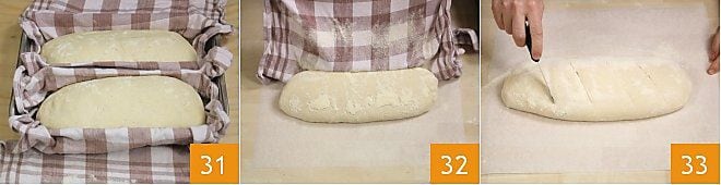Después de este tiempo, las barras estarán bien infladas y listas para el horneado 31. Precalienta el horno estático a 240 ° dejando dentro la bandeja en la que se cocerán las barras (se recomienda, para quien lo tenga, colocar una piedra refractaria en el fondo del horno en lugar de la bandeja), que deberá estar bien caliente. Si tienes un horno ventilado, ajusta la temperatura a 220 °. Agarrando los extremos del paño, voltea una barra a la vez sobre un papel de horno 32: ¡no toques demasiado el pan, de lo contrario, se desinflará! Realiza, con un cuchillo de hoja lisa y bien afilado, unas incisiones diagonales 33. También puedes no hacerle incisiones si prefieres.