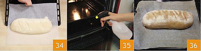 Haz deslizar el papel de horno sobre la bandeja muy caliente 34 y antes de meter el pan al horno, rocía con un vaporizador en el horno agua fría, 3-4 veces 35. Como alternativa al vaporizador, puedes poner en el fondo del horno una bandeja que contenga 3-4 cubitos de hielo. Mete el pan al horno y vuelve a rociar agua 3-4 veces. Mete el pan a 1/3 de la altura del horno (así que bastante bajo) y deja cocer el pan durante unos 20 minutos en horno estático (en ventilado durante 30 minutos). Después de este tiempo, baja la temperatura a 200° (180° si es ventilado) y continúa la cocción durante otros 15-20 minutos. Una vez cocido, saca el pan y colócalo a enfriar sobre una rejilla. Tu pan cafone está listo 36: ¡verás qué bueno está!
