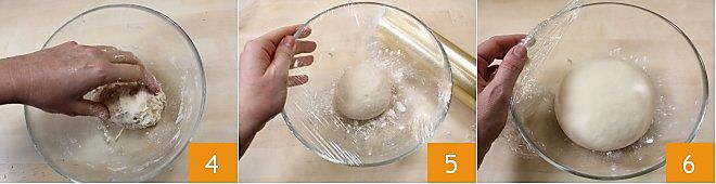 amasa hasta obtener una masa lisa y homogénea, que modelarás en forma de bolita 4. Deja leudar esta primera masa durante al menos 3 horas en el bol, ligeramente enharinado, cubierto con film, dentro del horno apagado con la luz encendida. El volumen inicial, después del tiempo, deberá duplicarse 6.