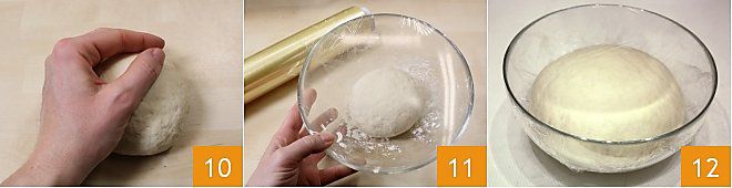 amasa todo, como hiciste antes 10. Pon también la segunda masa a leudar durante al menos 3 horas en un bol, cubierto con film, en el horno apagado con luz encendida 11. Cuando también la segunda masa haya leudado 12 podrás pasar a la realización de la masa final.